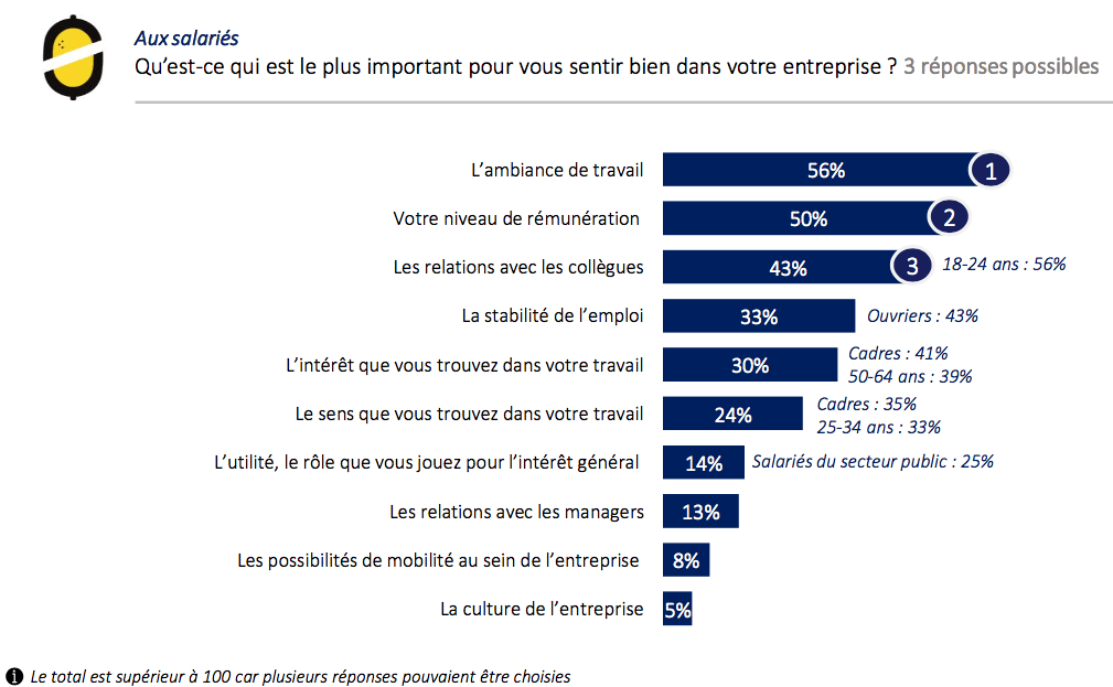 . L’ambiance de travail apparait comme le critère clé du bien-être en entreprise (56%), avant même le niveau de rémunération (50%)